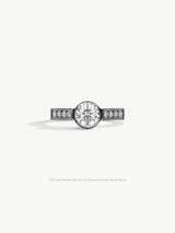 Signify your love with our Octavian Lotus Engagement Ring by Egyptian-Dominican jewelry designer Angie Marei featuring a magnificent round brilliant-cut white diamond mounted on a blackened 18-karat gold setting carved with elegant details of an Ancient Egyptian lotus flower accented with sparkling white diamonds.