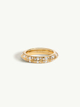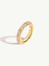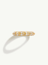 The Palmyra Eternity Band, created by Angie Marei, is an exquisite piece of jewelry made from 18-karat yellow gold and studded with sparkling brilliant-cut white diamonds. The inspiration for the design comes from Ancient Egyptian architecture and desert palm trees, which are reflected in the textures and negative spaces of the intricate details. The elaborate design is sure to become an heirloom piece that generations will cherish. The ring can be worn as a wedding band or as a statement piece.