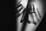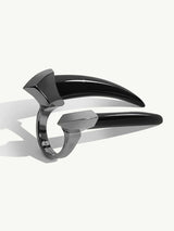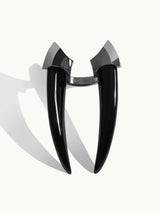The Damian Black Onyx Talisman Horn Ring by Angie Marei features two hand-carved and polished black onyx horns mounted in a luxurious blackened sterling silver setting. With its salient features, the smooth onyx stones and sculptural shiny blackened silver create an evocative and unique silhouette taking inspiration from apotropaic talismans worn by the royal Ancient Egyptians. This monumental jewel is meant to be worn and proudly displayed with an air of confidence that will surely captivate and subdue your audience.