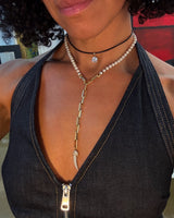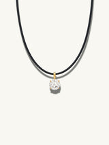 A modern twist on a timeless classic. Handcrafted with intention, this refined necklace features a brilliant-cut white diamond cradled in a sleek four-prong setting, suspended from a supple black leather cord. The contrast between the radiant stone and the understated leather offers a striking balance of elegance and edge. Minimal yet powerful, this piece evokes effortless sophistication—perfect on its own or layered with other cherished favorites.