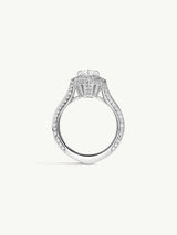 Derived from Hebrew origins, "Atara" embodies meanings of "crown" and "blessed." Drawing inspiration from the regal crowns of antiquity, Marei ingeniously crafted this piece with a geometric, three-dimensional halo of sparkling pavé diamonds. This intricate design elegantly encircles and highlights the exquisite pear-cut diamond center stone. Reflecting regal opulence, Atara's design emphasizes height and splendor, ensuring a truly unforgettable presence.