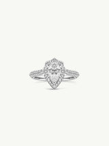 The Atara Engagement Ring, envisioned by Angie Marei, showcases a mesmerizing brilliant-cut pear-shaped white diamond center stone, expertly mounted on a platinum setting embellished with radiant pavé set brilliant-cut white diamonds.