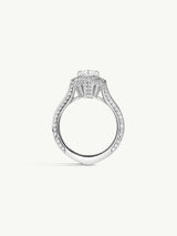 Derived from Hebrew origins, "Atara" embodies meanings of "crown" and "blessed." Drawing inspiration from the regal crowns of antiquity, Marei ingeniously crafted this piece with a geometric, three-dimensional halo of sparkling pavé diamonds. This intricate design elegantly encircles and highlights the exquisite pear-cut diamond center stone. Reflecting regal opulence, Atara's design emphasizes height and splendor, ensuring a truly unforgettable presence.