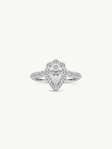The Atara Engagement Ring, envisioned by Angie Marei, showcases a mesmerizing brilliant-cut pear-shaped white diamond center stone, expertly mounted on a platinum setting embellished with radiant pavé set brilliant-cut white diamonds.