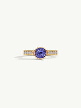 • Accent Stones: Gypsy-set brilliant-cut round natural white diamonds; Diamond Grade: DEF Color, VS+ Clarity. Approximately 0.25-carat total weight.
