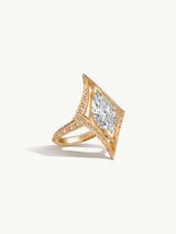 The Palmyra Diamond Engagement Ring by Angie Marei features an exquisite, brilliant marquise-cut diamond framed in a glittering pavé-set diamond mounting handcrafted in polished 18-karat yellow gold. The inspiration for this unique design is drawn from Ancient Egyptian architecture and desert palm trees, reflecting the textures and negative spaces of its intricate details. Its elaborate design is sure to become an heirloom piece that generations of admirers will cherish.
