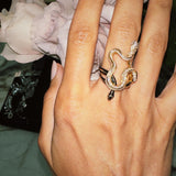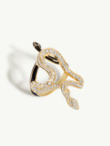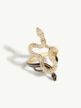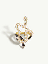 Inspired by the legendary allure and tragic end of Cleopatra, the Black Opium Hayya Pavé White Diamond Serpentine Ring II. by New York jeweler Angie Marei exude a dark, sultry glamour. Handcrafted as wearable works of art, each one-of-a-kind ring coils with serpentine grace, glittering with brilliant-cut white diamonds and inlaid with rich black enamel. Mysterious. Seductive. Unforgettable.