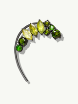 The Isadora Ear Cuff by Angie Marei is finely handcrafted in luxurious blackened silver and set with exotic and vibrant green precious gemstones. This beautiful ear cuff design is inspired by decorative and colorful Japanese Kanshaji hairpins worn to ward off evil spirits and occasionally used as discreet self-defense tools. Includes an array of various cuts of brilliant Peridot, Green Tourmaline, Tsavorite Garnets, and Chrome Diopside precious gems.