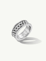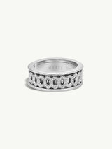 The Amanti Spinning Infinity Ring by New York jewelry designer Angie Marei is exquisitely handcrafted with great precision in luxurious platinum precious metal. This elegant design possesses an intricate pattern of brilliant pavé diamond geometric dimensional windows creating a glittering vignette that shines and reflects light from all angles.
