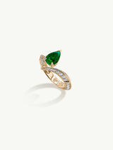 The Dorian Floating Teardrop-Shaped Emerald Engagement Ring by Angie Marei features an exquisite vivid green Emerald designed to mirror a water droplet delicately held in suspension. Skillfully handcrafted in 18-karat yellow gold with rows of brilliant-cut pavé-set white diamonds. Visualize the soft waves of the ocean as they bind together with the strength of the human spirit.