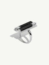 The Invidia Black Onyx Column and White Diamond Ring by Angie Marei is masterfully handcrafted in opulent 18-karat white gold. This sculptural piece features striking columns of hand-carved and polished black onyx, flanked by step-cut baguette white diamonds and pavé-set brilliant-cut round white diamonds. Sleek, structured, and architecturally bold, this design draws inspiration from the refined elegance of the Art Deco era and the rich visual language of Ancient Egyptian art.