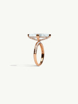 The Marei Diamond Halo Engagement Ring by jewelry designer Angie Marei, showcases a stunning brilliant-cut Marquise White Aquamarine jewel enthroned in an Art-Deco-inspired claw setting. Handcrafted from 18-karatrose gold and pavé-set brilliant-cut round white diamonds, this gorgeous piece will dazzle and delight the senses with its hidden halo of sparkling white diamonds creating a sparkling effect around the centerpiece gemstone.
